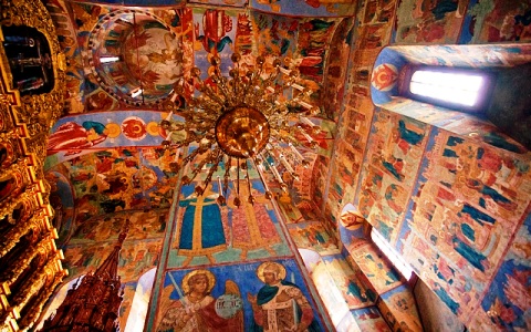 Ma il fascino della cattedrale è dato dagli affreschi interni, dal colore puro e vivo, che ricoprono ogni parte: dalle pareti, agli archi, ai pilatri. Pensate che questi affreschi risalgono al 1685 e sono stati dipinti da un’importantissima scuola di pittura guidata dal maestro Nikitin in soli 3 mesi e con una squadra di 18 persone. Sono strutturati su 5 livelli, con circa 80 composizioni.